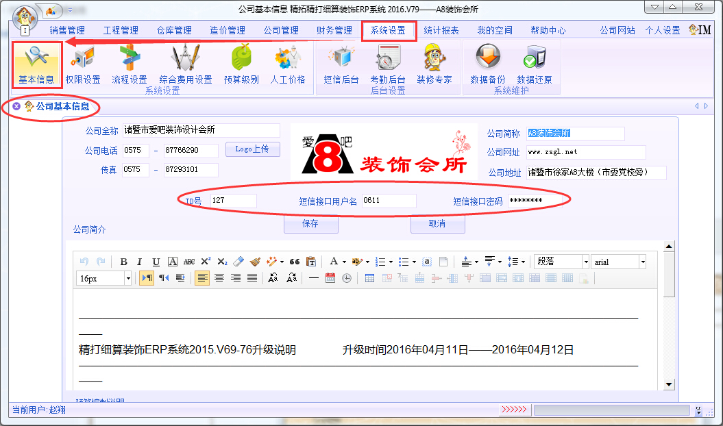 左鍵打開(kāi)公司基本信息,輸入由精拓公司給你的短信ID號(hào)碼,短信接口用戶名,然后自己設(shè)置一個(gè)登錄密碼,保存即可。